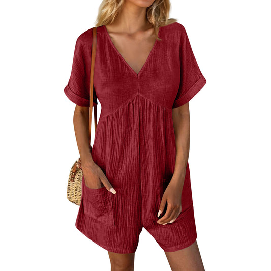 European And American Fashion Solid Color And V-neck Loose Bat Sleeve Pocket Zipper Short Sleeve Jumpsuit